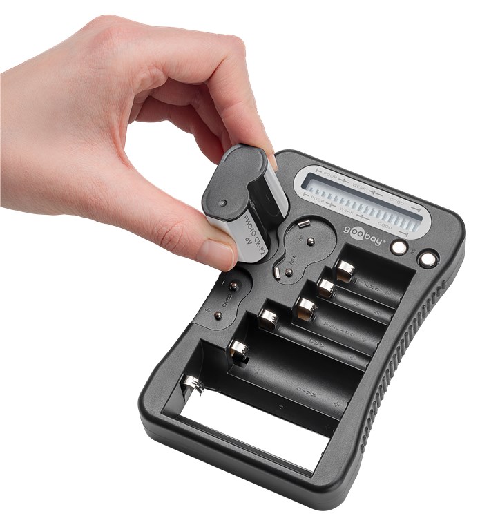 Der Batterieprüfer zeigt auf einen Blick den Energiestatus verschiedenster Batterietypen an und hilft so, zwischen einer leeren Batterie und einem defekten Gerät zu unterscheiden.