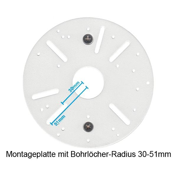 - Universelle Montageplatte mit einem Durchmesser von 120mm, geeignet für Produkte mit Bohrlöcher-Radius von 30 bis 51mm