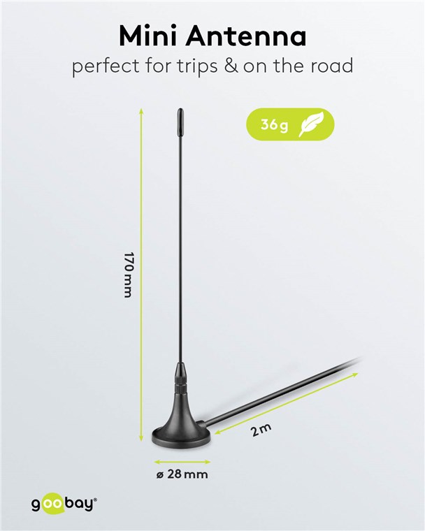 Passive DVB-T2 (HD) Mini-Magnetantenne 3 dBi-Antenne zum Empfang von DVB-T-/DVB-T2-HD-Programmen Zimmerantenne zum Empfang von analogen und digitalen TV-Signalen im VHF-Bereich (174 MHz - 230 MHz) und UHF-Bereich (470 MHz - 862 MHz)
