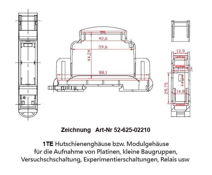 Hutschienengehäuse Leergehäuse Modulgehäuse für Platinen ... kleine Regler... Steuerungen .... u.s.w. Aufrastbar durch Schnappfuss auf klassische 35mm Hutschienen. Hutschienengehäuse, Leergehäuse, Modulgehäuse, für Montage auf DIN Schiene ( TS35 Hutschiene ) geeignet Schaltschrankbau, Hausverteiler.... Testschaltungen, Versuchsaufbauten ......  Aufrastbar durch Schnappfuss auf klassische 35mm Hutschienen Gehäuse Unter- und -Oberteil rasten ineinander ein und können verschraubt werden Schraub- oder Snap-in Verriegelung zwischen Boden und Deckel.  anschließen der Ein- und Ausgänge über Anreihklemmen RM 5,08 die sich z.B. dann auf der Platine befinden  Führungsnuten für einfache Leiterplattenmontage Innen Aufnahme für eigne Platinen, Prüf- und Testschaltungen usw.  ABS-Gehäuse mit Schnappfuß für Hutschienen wie im Schaltschrankeinbau, Hausverteilung üblich  für Hutschiene nach DIN EN 50022 Die üblichste Hutschienenbreite 35mm Breite ( 35/7,5 ode 35/15mm )  Gehäusematerial ABS,  Lieferung mit Schnappfuss für den Schaltschrankeinbau auf TS35 Hutschiene Farbe hellgrau ähnlich RAL7035 Abmessungen:  Aussenabmessungen: B: 17,5mm H: 55,8mm T: 90,0mm ( ohne Schnappfuß für Hutschiene )  Innenabmessungen: B: 15,0mm H: 50,3mm / H2: 35,2mm / H3: 22,3mm ( H3 = bei Klemmen ) T: 86,10mm  Baubreite 1TE  Siehe auch Zeichnung  INFO: Zusatzinfo zu TE = Teileinheit = Baubreite ( z.B. Sicherungsautomat hat auch 1TE Baubreite ) Einbaubreite 1TE der Geräte soll nach der Norm DIN 43880 zwischen 17,5 und 18,0 mm