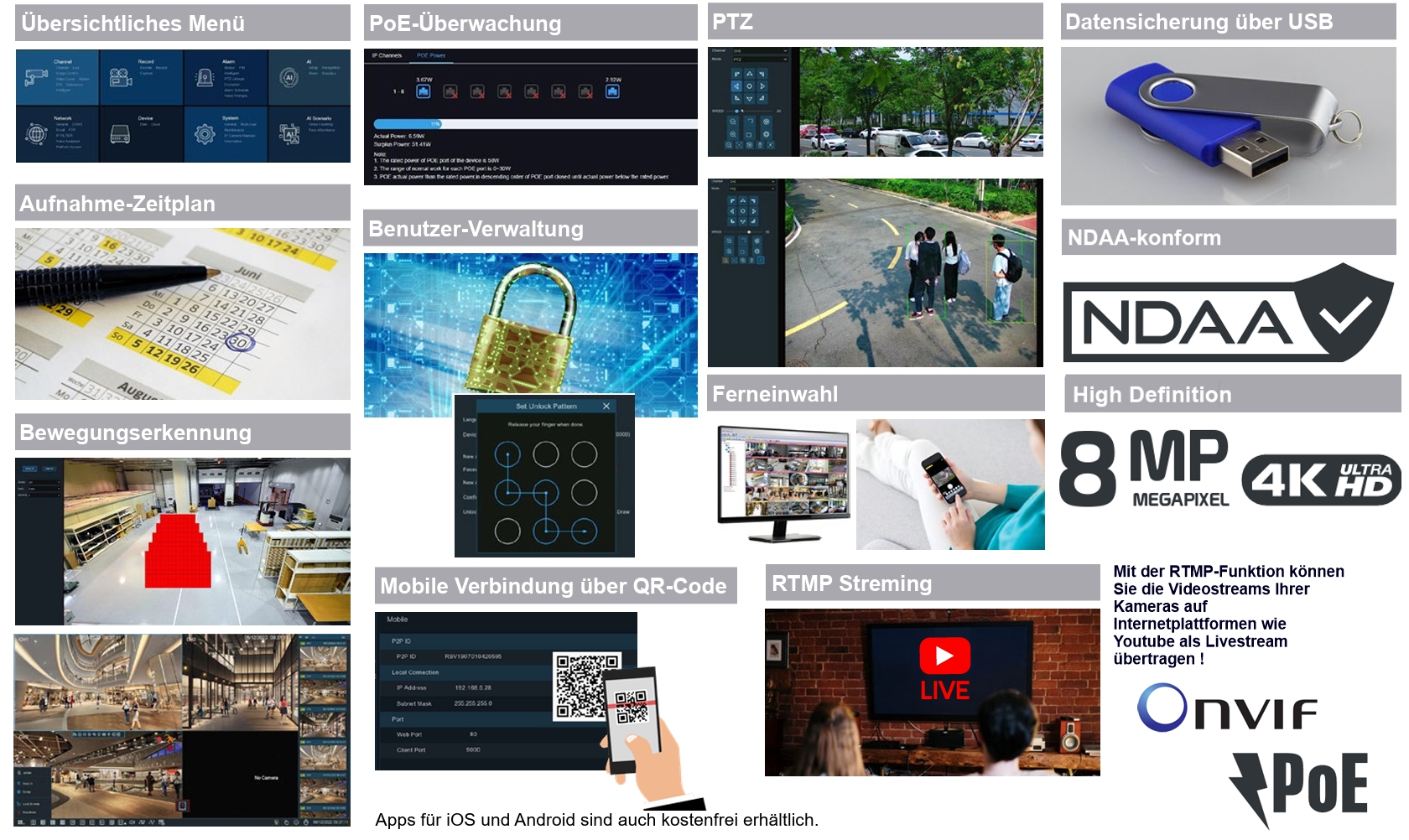 + NVR IP Kamera Rekorder mit Fernzugriff via Netzwerk / Internet / Smartphone / Tablet