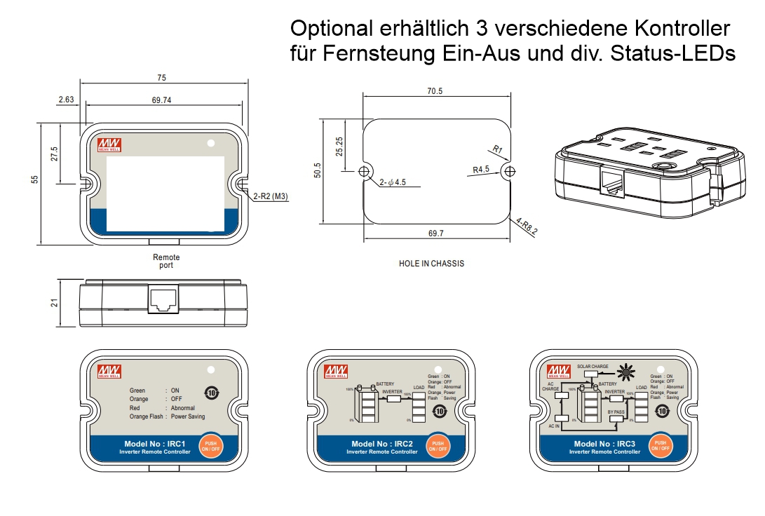 Kabelfernbedienung Fernschalter mit 14 Status LED-Anzeige DCAC Wechselrichter 43-846-06208 + 43-846-06224