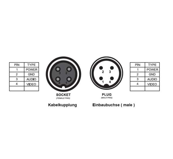 Kamerakabel für KFZ Kamera kurzer Adapter 4pol Mini-Tuchel 9mm Serie auf Cinchstecker Kurzer Adapter für den Anschluß von KFZ Kameras mit entsprechendem GX16 Verbinder Mini-Tuchel 4pol Steckverbinder ( 8,8/15,5mm angespritzt nicht öffenbar ) auf 2x RCA-Cinchstecker und 2x Hohlsteckerbuchse für 12V ( PS am besten 41-149-00300 gleich mitbestellen Stecker hierzu Schraubkontakt ) Kabellänge ca. 55cm / Kabeldurchmesser ca 5,2mm Steckverbinder angespritzt nicht öffenbar Schutzgrad IP66 Abmessungen zu Steckverbindern und Pinlayout siehe weitere Bilder ( nur zur Info, ggf. vergleichen ! ) Zusatinfo: KFZ-Kamerakabel wie folgt erhältlich : Art-Nr 79-240-03323 = selber Adapter nur mit Mini-Tuchel Kupplung und Cinchsteckr Art-Nr 79-240-03324 = kurzer Adapter = 4pol Adapter auf RCA-Cinchstecker mit 12V Litzenkabel Art-Nr 41-149-00300 = DC-Stecker GERADE 5,5x2,1mm mitSchraubanschluss Art-Nr 79-240-03328 = 10m IP68 Kabel 4pol Stecker auf 4pol Buchse Art-Nr 79-240-03329 = 20m IP68 Kabel 4pol Stecker auf 4pol Buchse
