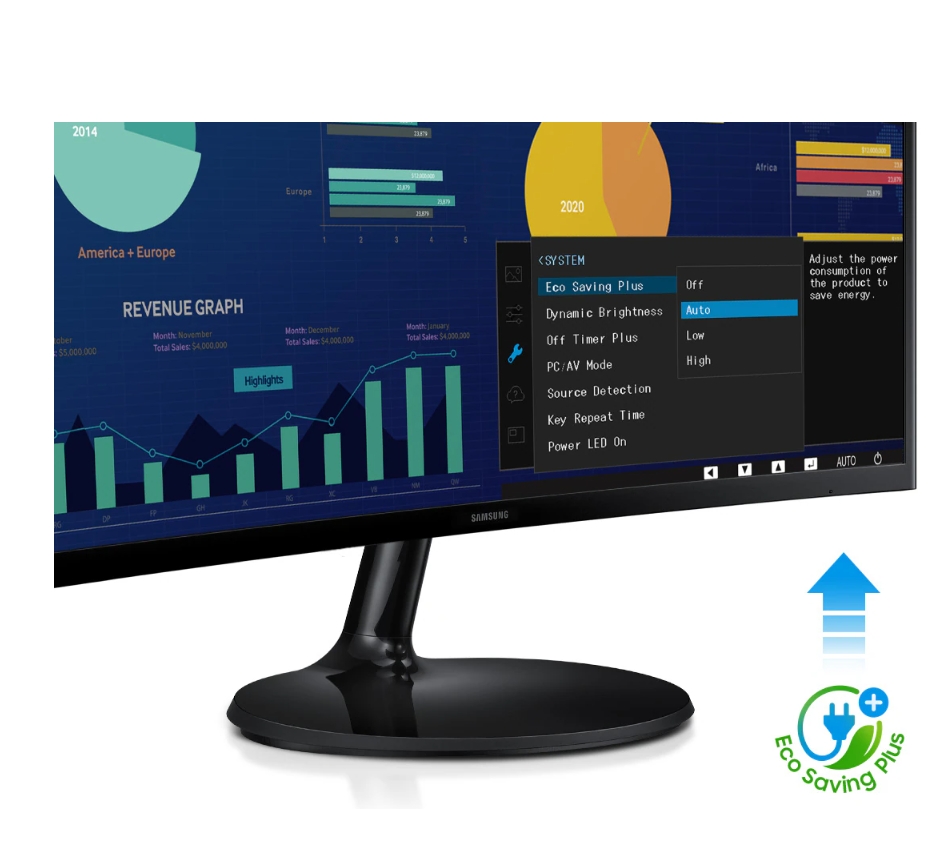 + Energiesparend eingestellt = Eco Saving Plus Der für seine Energieeffizienz zertifizierte Samsung-Monitor verfügt über den Eco Saving Plus-Modus, der bis zu 10 % Energie einsparen kann.