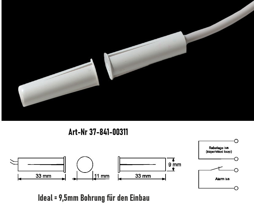 Für versenkte Anwendungen im Innen- und Außenbereich. Auch nützlich zum Schutz von Fenstern, Doppelfenstern, Aluminiumfenstern und auch Türen sowie natürlich auch Vitrinen Kleiderschränke usw. Diese Magnetkontakt ist ein kompakter und zuverlässiger Einbaukontakt, der für den Einsatz in Sicherheitssystemen Türen Fenster entwickelt wurde , bei denen eine unauffällige und sichere Installation erforderlich ist. Dank der Presseinpassung ist die Montage schnell und einfach , ohne den Einsatz von Schrauben oder Kleber . Dadurch eignet sich der Kontakt besonders für einen sauberen Abschluss bei bündiger Montage. Das robuste Gehäuse ist widerstandsfähig gegen Quetschungen und andere mechanische Einwirkungen , was der Langlebigkeit des Produkts zugute kommt . Für zusätzliche Sicherheit ist eine Sabotageschleife im Lieferumfang enthalten, die Schutz vor Manipulation oder ungewollter Demontage des Kontakts bietet . Der Kontakt ist normalerweise geschlossen ( NC) und hat einen maximalen Schaltabstand von ca. 12mm. Durch die weißen Kunststoff fügt es sich harmonisch in die Umgebung ein . Durch das mitgelieferte 2 Meter lange Kabel ist der Kontakt ideal für Situationen , in denen eine kurze , übersichtliche Verkabelung erforderlich ist .