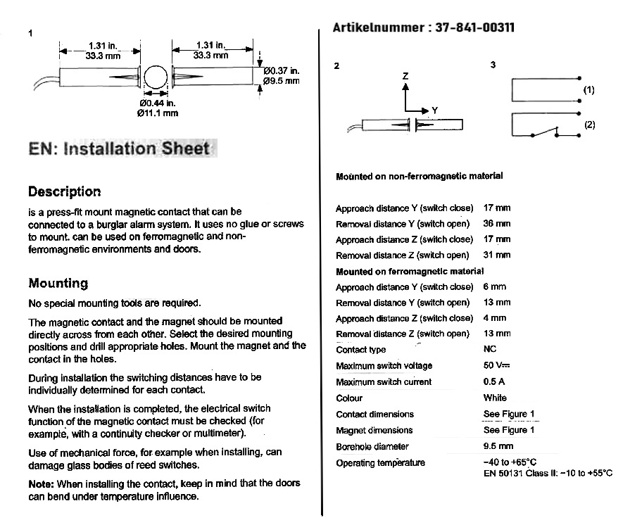 Die Magnetkontakte ermöglichen die Erkennung der Tür- und Fensteröffnung usw. Der hermetische dichte Kontakt mit Flansch ist für die Einbaumontage ausgelegt. Durch die Art der Montage ist er nach der Installation von außen unsichtbar.