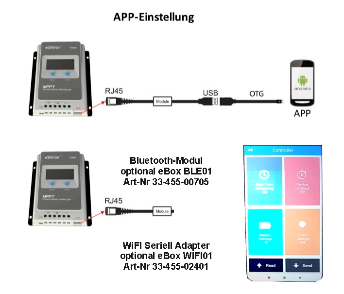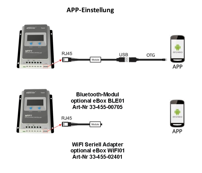 Zubehör Bluetooth Modul eBox BLE01 für Laderegler Tracer AN BN XTRA-N Triron SerieBox eBox-BLE-01 ermöglicht eine drahtlose Überwachung mittels Bluetooth-Kommunikation zwischen den dazu passenden Solarreglern und oder Wechselrichtern der Firma EPsolar / EPEVER und der Smartphone APP. Die Parametereinstellung, das Überwachen etc. ist komfortabel über das Interface der APP möglich. Funktionen im Überblick Ermöglicht die drahtlose Monitoring-Überwachung des Solarregler / Wechselrichters Unterstütztung der Smartphone APP durch einfache Plug and Play Einstellung High-Performance Bluetooth-Chip mit ultra-niedrigem Stromverbrauch Unterstützt Bluetooth 4.0 und BEl-Technologie Schnelle Kommunikation mit starker Anti-Interferenz-Fähigkeit Keine externe Stromversorgung notwendig Sende- und Empfang-Entfernung bis zu 10 Meter Master-Reset-Adapter 1,5m Netzwerkkabel beiliegend Abmessungen Modul: B: 68mm T: 52mm H: 25mmBenötigte Software APP: https://www.epsolarpv.com/downsoft.html nur für Android nicht füür Apple geeignet. APP nur über Webseite abrufbar nicht über GooglePlay ! Kompatibel mit folgenden Ladereglr und Wechselrichter Serien von EPSolar / EPEVER Serien : LS-B / VS-BN / Tracer-A / Tracer-AN / Tracer-BN / eTracer-AD / eTracer-BND / iTracer-ND / XTRA / DuoRacer GoMate / STI / SHI / IPower Die Verbindung über Bluetooth funktioniert nur mittels der EPsolar APP (Download unter https://www.epsolarpv.com/downsoft.html) Diese Android APP ist kostenlos und wird über einen externen Server ( nicht GooglePlay oder Apple Playstore ) angeboten.