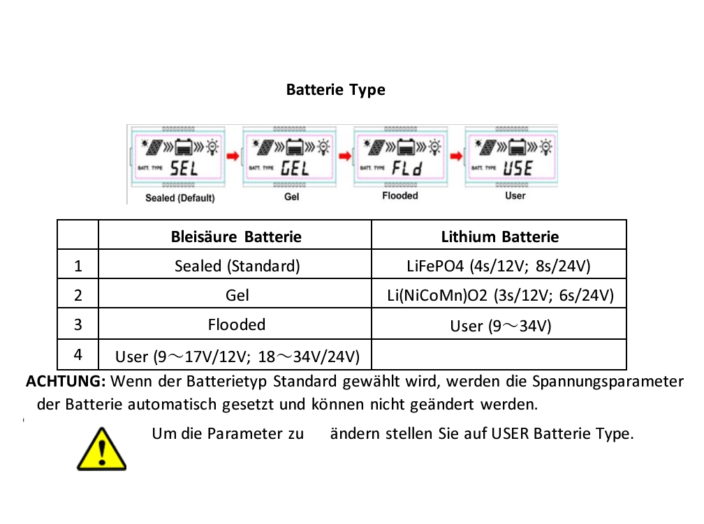- 4 Batterietypen einstellbar ( offene Säure, AGM, Gel, Lithium, LiFePo4, NiCoMn )