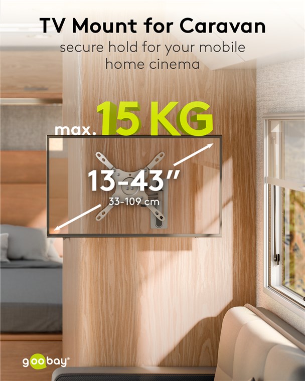 Mit der praktischen Wandhalterung verwandelt sich das Wohnmobil in ein mobiles Heimkino: Fernsehen, Filme und Streaming auf bis zu 43 Zoll Bildschirmdiagonale sorgen ab sofort auch unterwegs und im Urlaub für Entertainment.