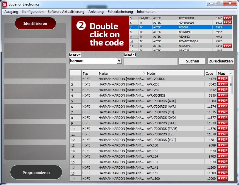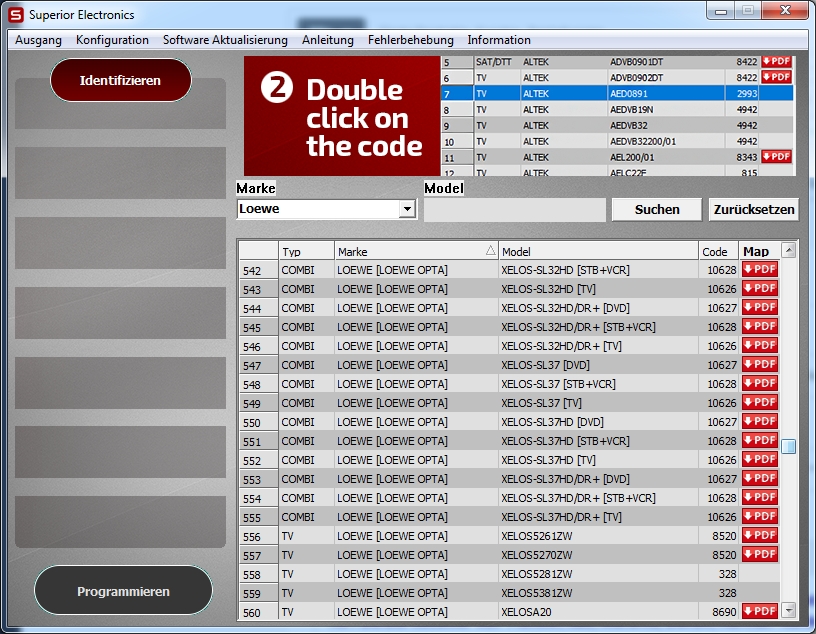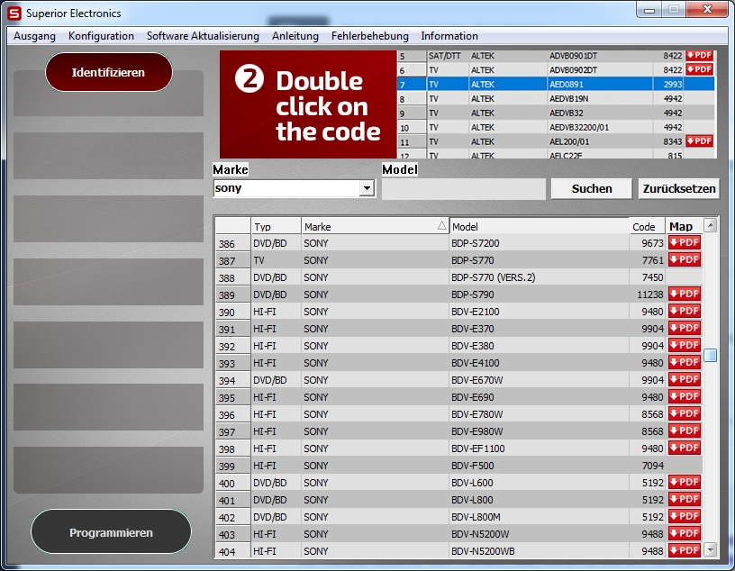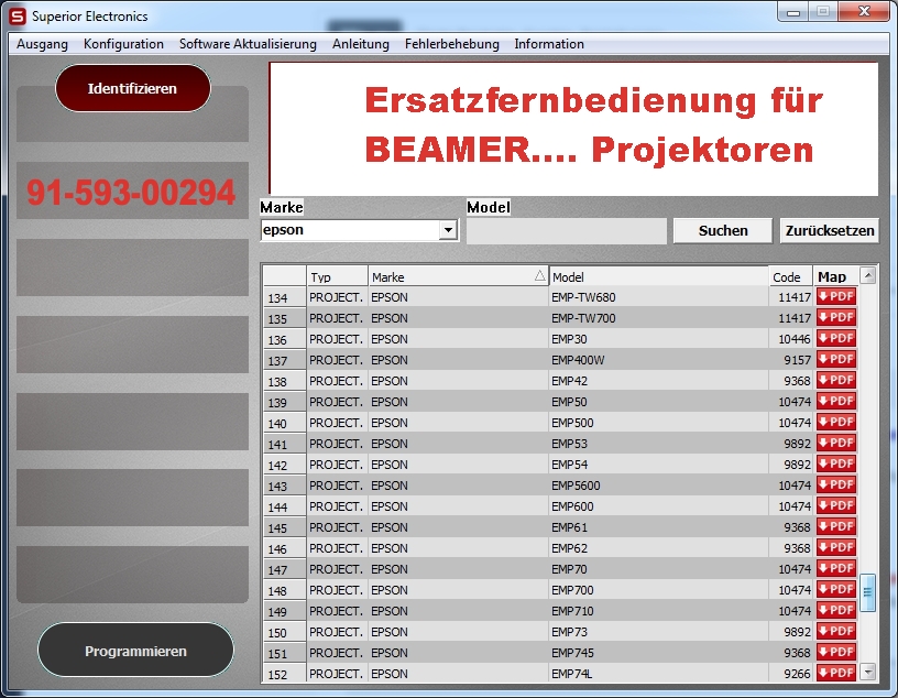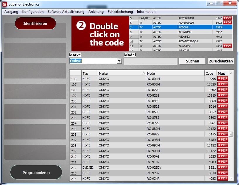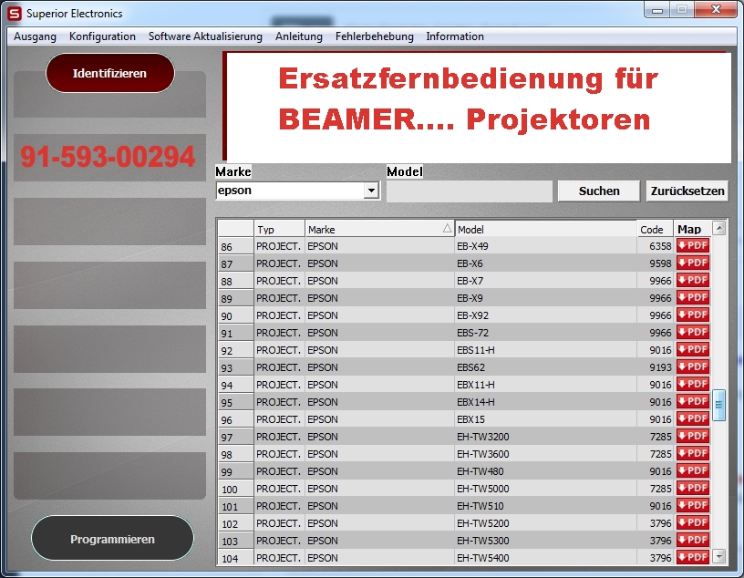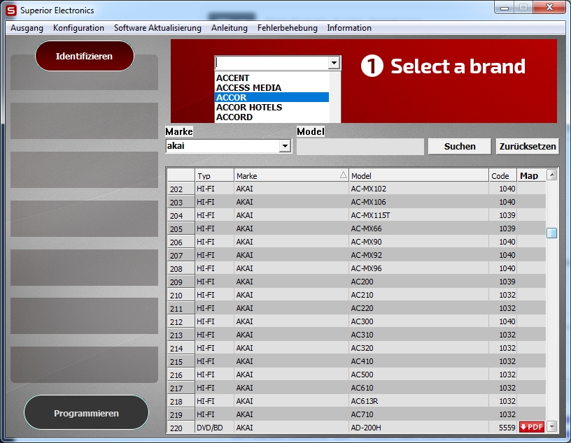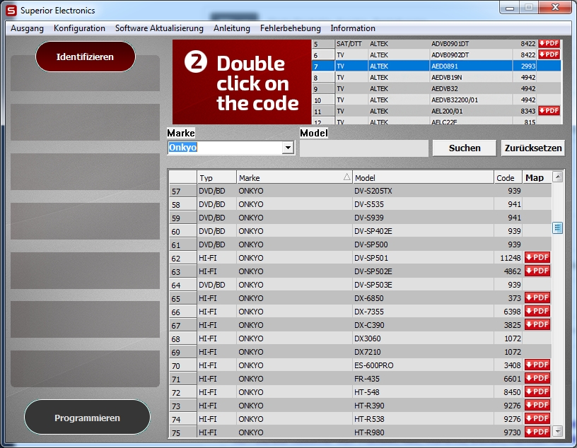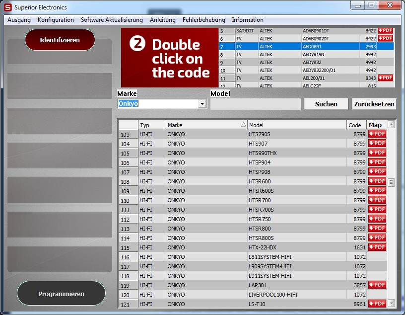 Mit Hilfe eines separaten Windows-kompatiblen USB-Programmierer kann die Fernbedienungen innerhalb weniger Minuten programmiert werden. Die Programmierung ist dabei denkbar einfach: Klicken Sie einfach auf die Marke und das Modell im Windows-Programm und schon ist sie einsatzbereit.