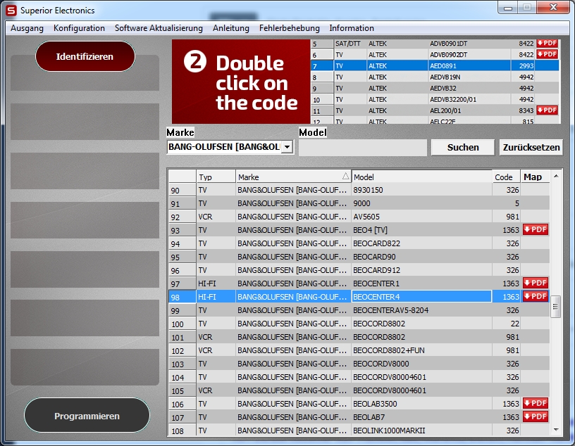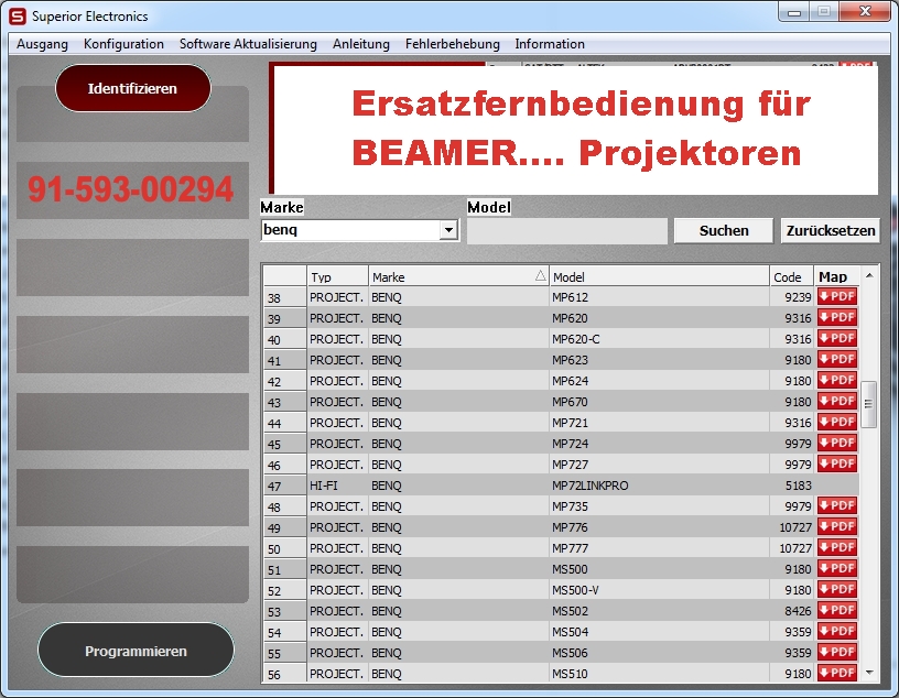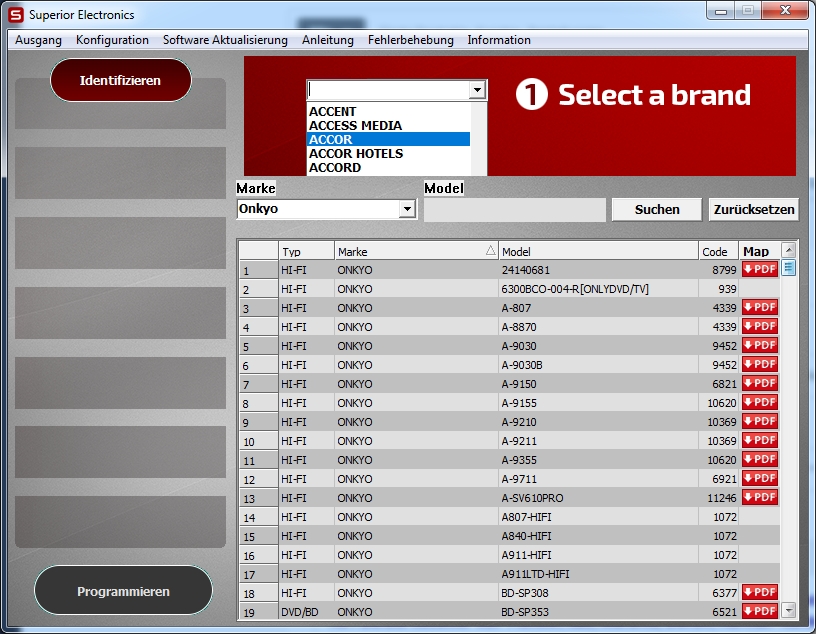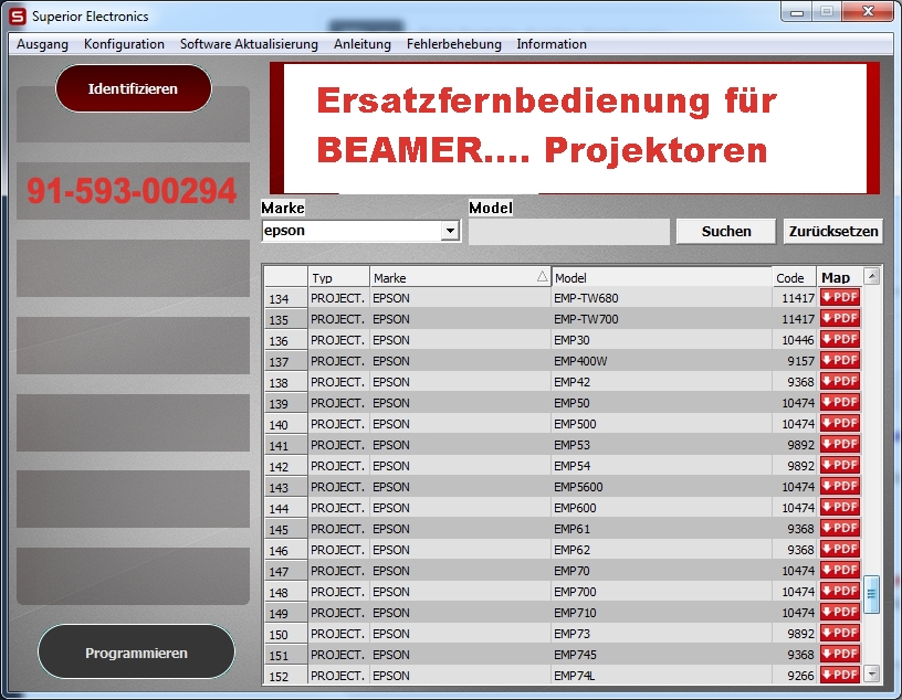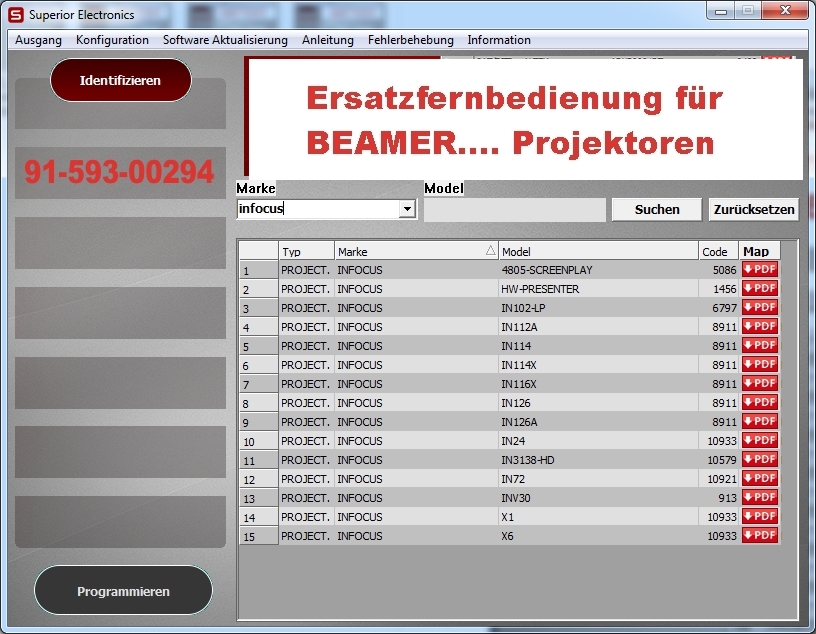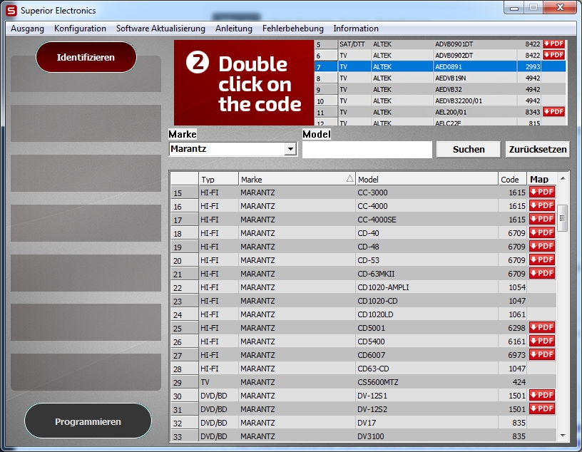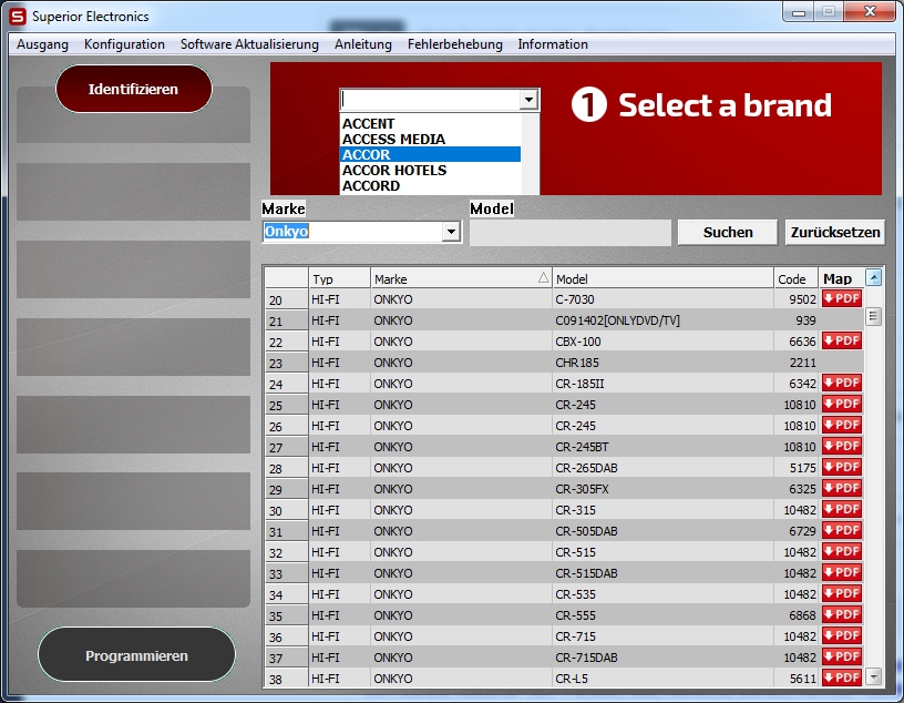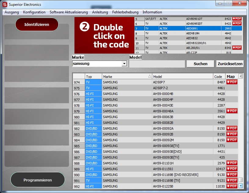 Mit Hilfe eines separaten Windows-kompatiblen USB-Programmierer kann die Fernbedienungen innerhalb weniger Minuten programmiert werden. Die Programmierung ist dabei denkbar einfach: Klicken Sie einfach auf die Marke und das Modell im Windows-Programm und schon ist sie einsatzbereit.