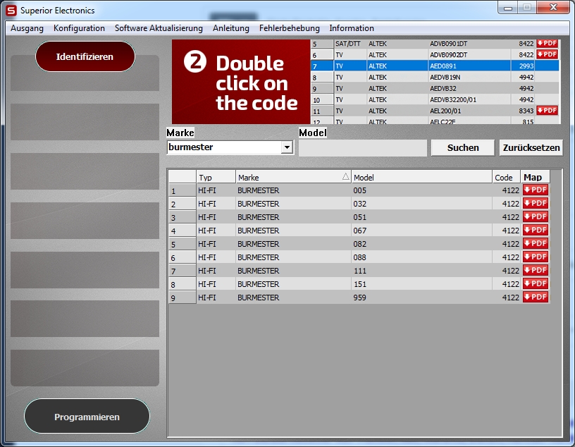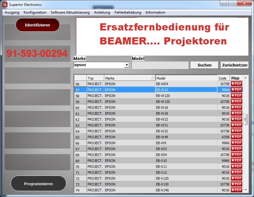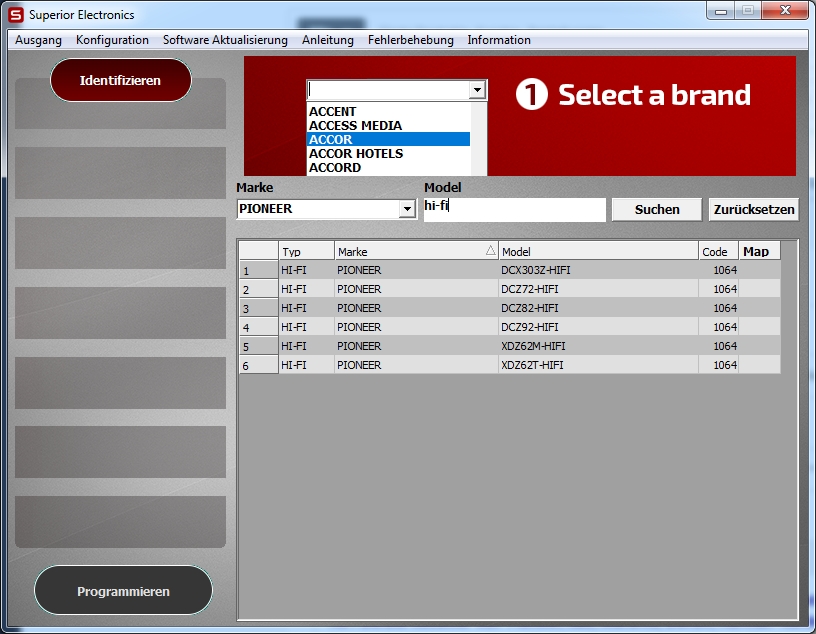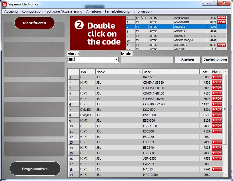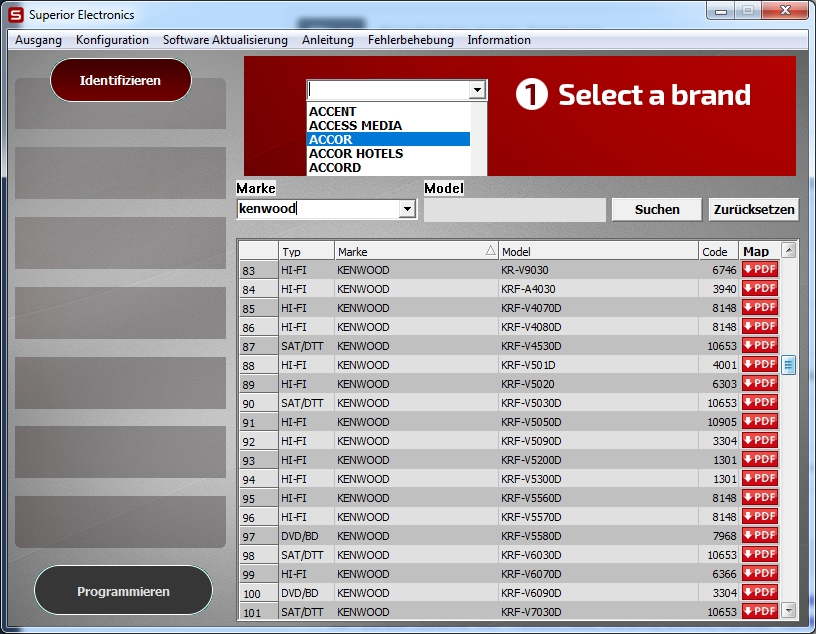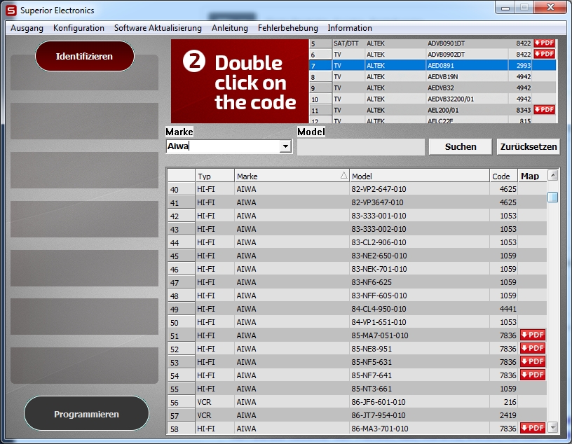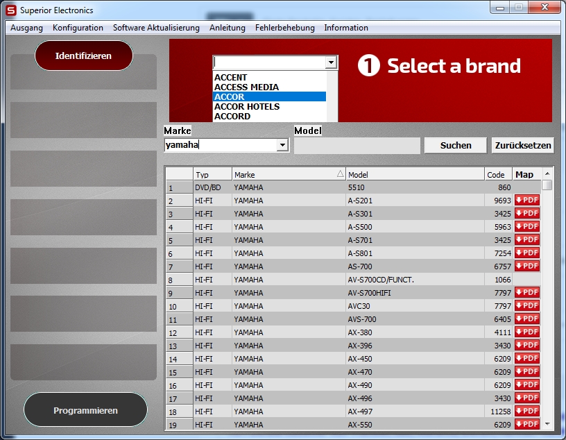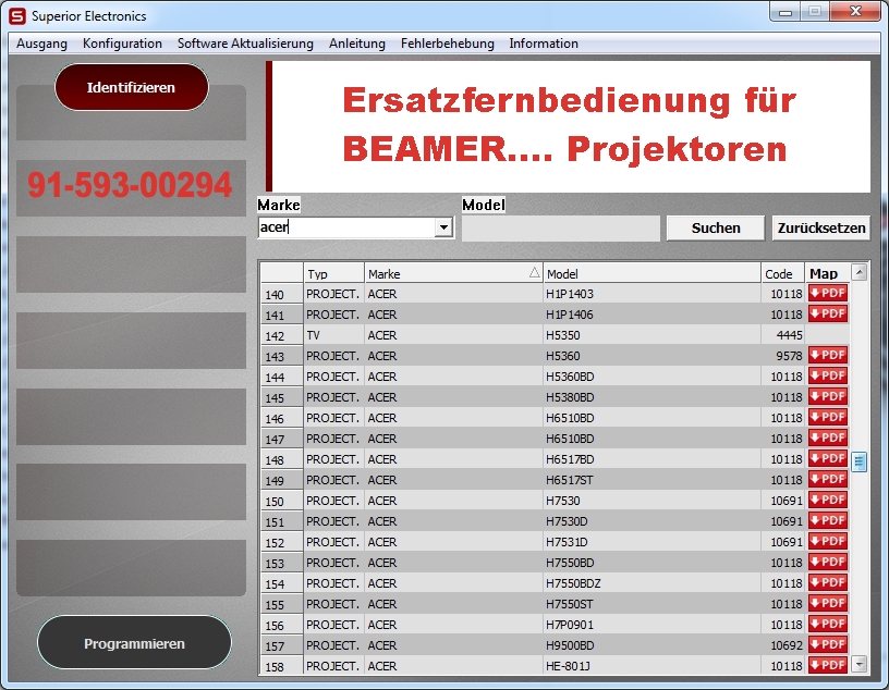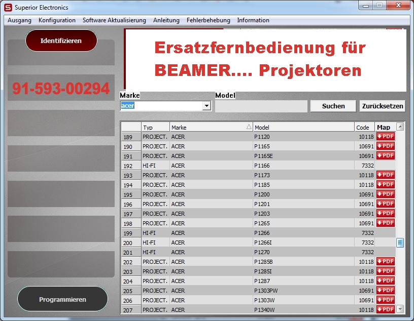Mit Hilfe eines separaten Windows-kompatiblen USB-Programmierer kann die Fernbedienungen innerhalb weniger Minuten programmiert werden. Die Programmierung ist dabei denkbar einfach: Klicken Sie einfach auf die Marke und das Modell im Windows-Programm und schon ist sie einsatzbereit.